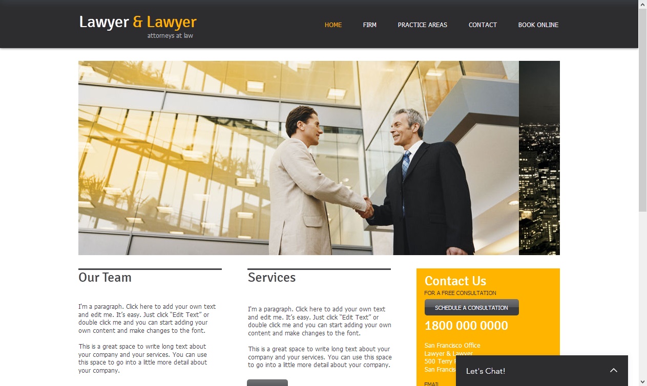 Το παραδοσιακό γίνεται μοντέρνο με αυτό το εκλεπτυσμένο πρότυπο ιστότοπου. Ιδανικό για νομικές, συμβουλευτικές και εταιρικές επιχειρήσεις, αυτό το πρότυπο σας δίνει αρκετό χώρο για να περιγράψετε τα προσόντα, την εμπειρία και τις υπηρεσίες σας. Ανεβάστε φωτογραφίες για να παρουσιάσετε τα μέλη της ομάδας σας και προσαρμόστε το σχέδιο και τα χρώματα αν χρειάζεται, ώστε να ταιριάζει με το επαγγελματικό σας προφίλ.