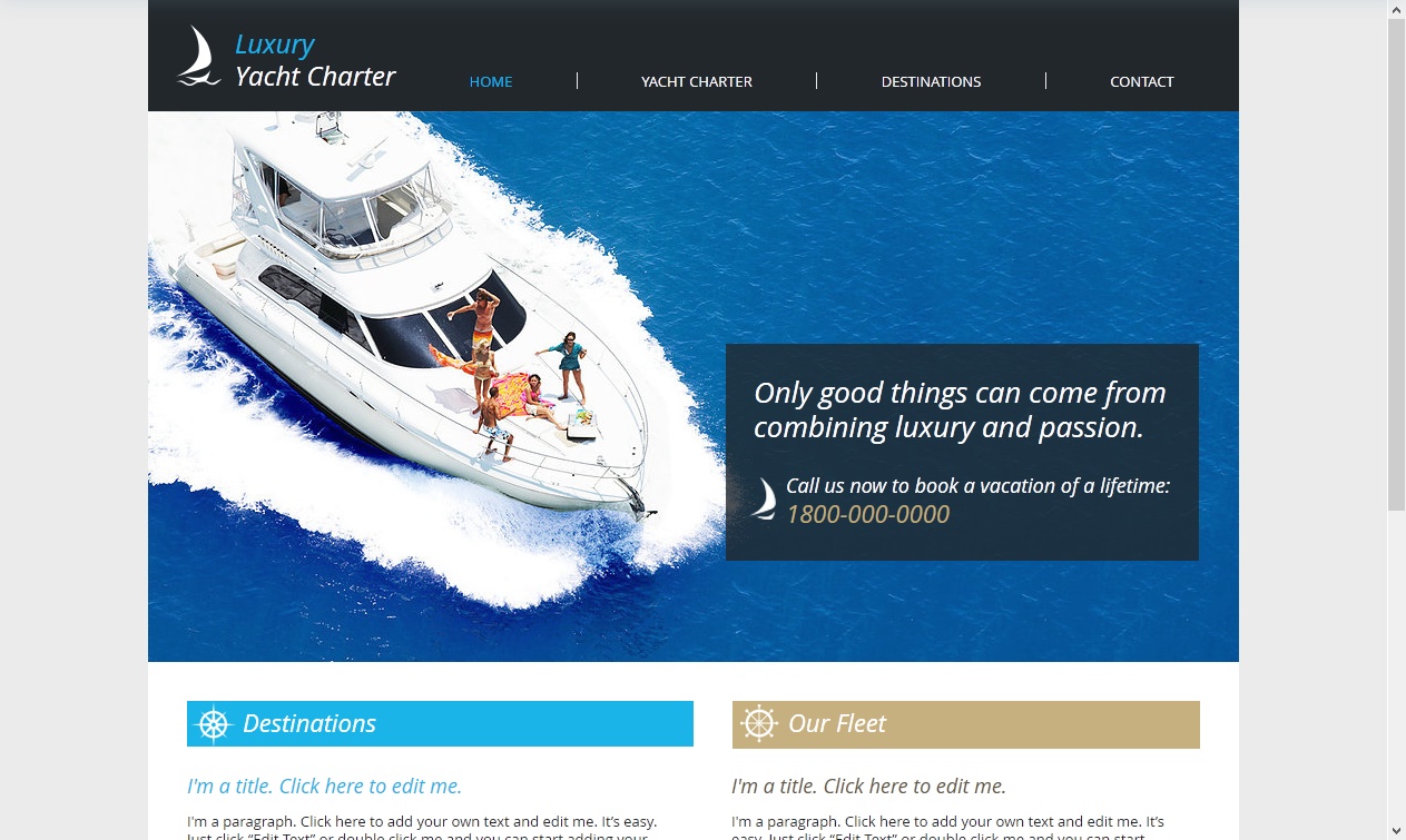 With clean design and classic style, this nautical-themed template awaits your boat charter or cruise ship company. Showcase your exotic destinations with multiple photo galleries and add text to introduce your packages and rates. All aboard!