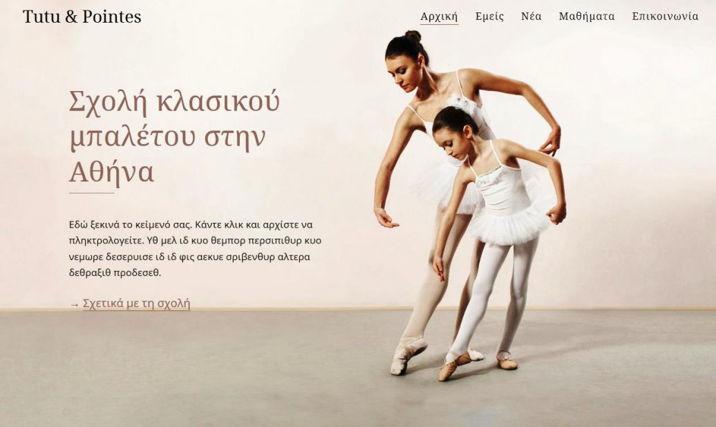 Το κομψό αυτό template είναι ιδανικό για σχολές μπαλέτου ή στούντιο χορού. Τα διακριτικά χρώματα και εικόνες συνδυάζονται τέλεια με τη θεματολογία, ενώ μπορείτε εύκολα να μοιραστείτε κάθε πληροφορία που θα ενδιαφέρει τους μαθητές σας. Προσθέστε το πρόγραμμα μαθημάτων, παρουσιάστε τους καθηγητές ή γράψτε ένα blogpost για την τελευταία σας πρόβα. Η ιστοσελίδα της σχολής σας δε θα μπορούσε να είναι περισσότερο en pointe!