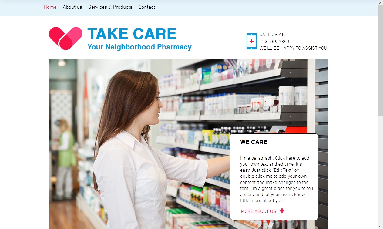 Ένα απλό πρότυπο για το φαρμακείο στο οποίο μπορείτε να βασιστείτε. Δημιουργήστε το online σπίτι σας με φωτογραφίες, χάρτες και κείμενα. επικοινωνήστε με τους πελάτες σας και δημοσιοποιήστε τις υπηρεσίες σας με αυτήν την πλήρως προσαρμόσιμη μορφή. Αποκτήστε online παρουσία και μεγαλώστε την επιχείρησή σας σήμερα!